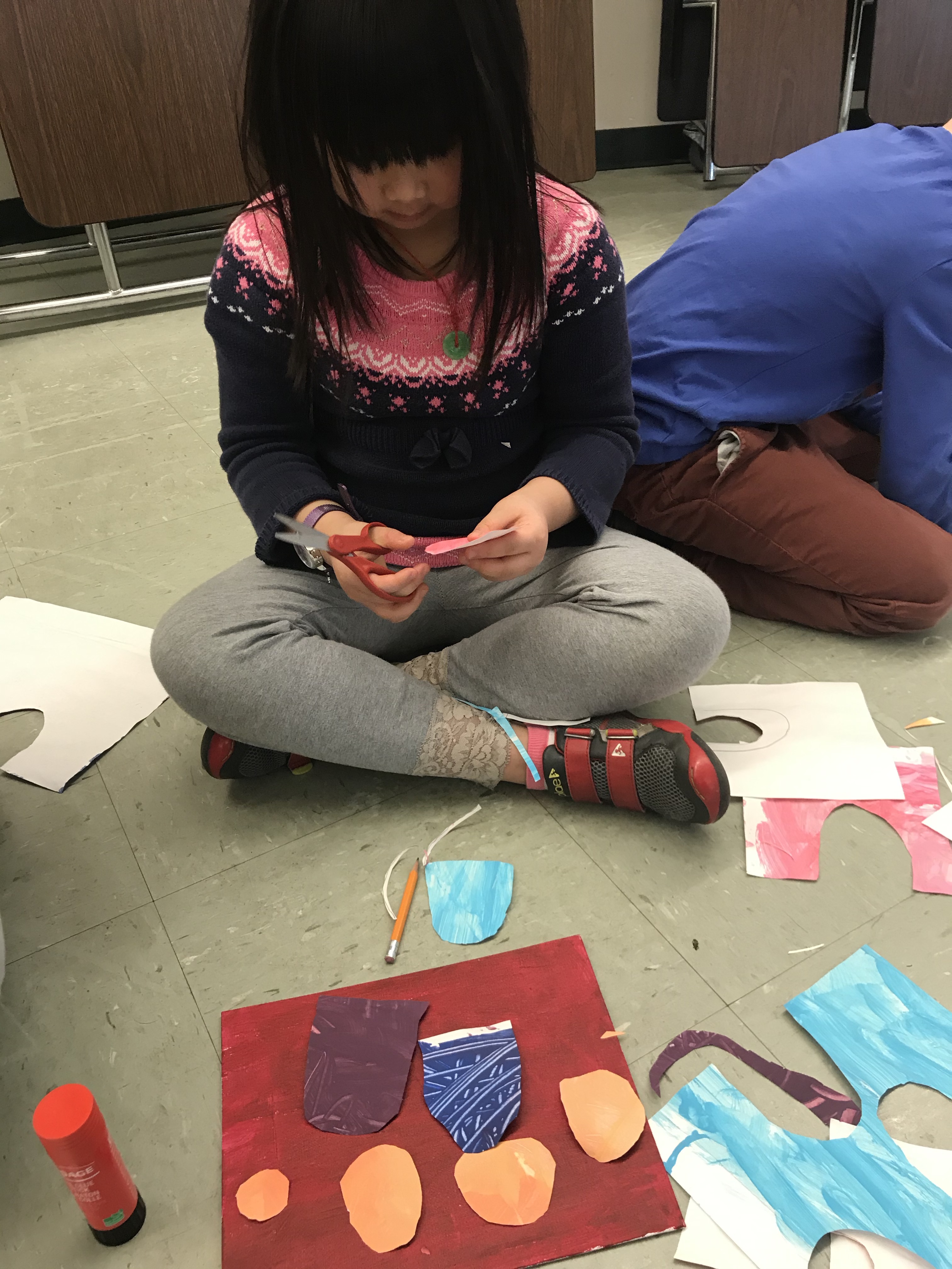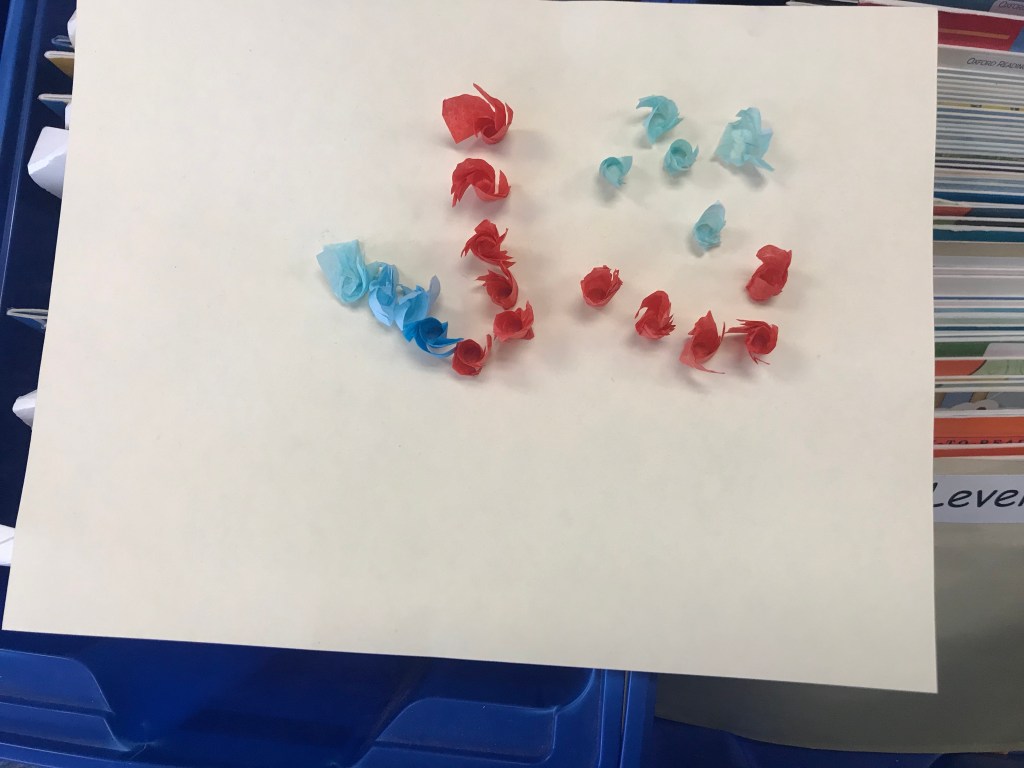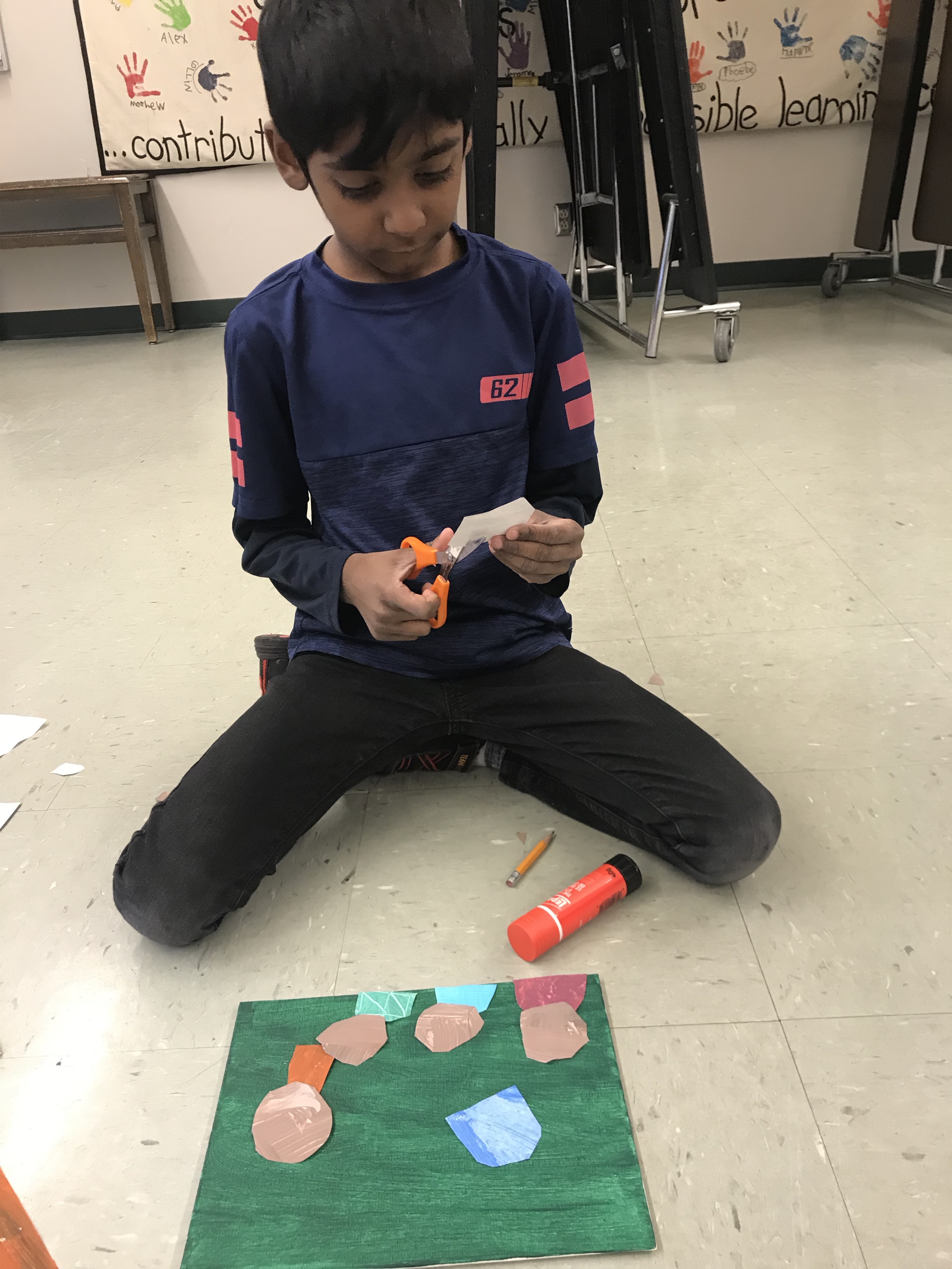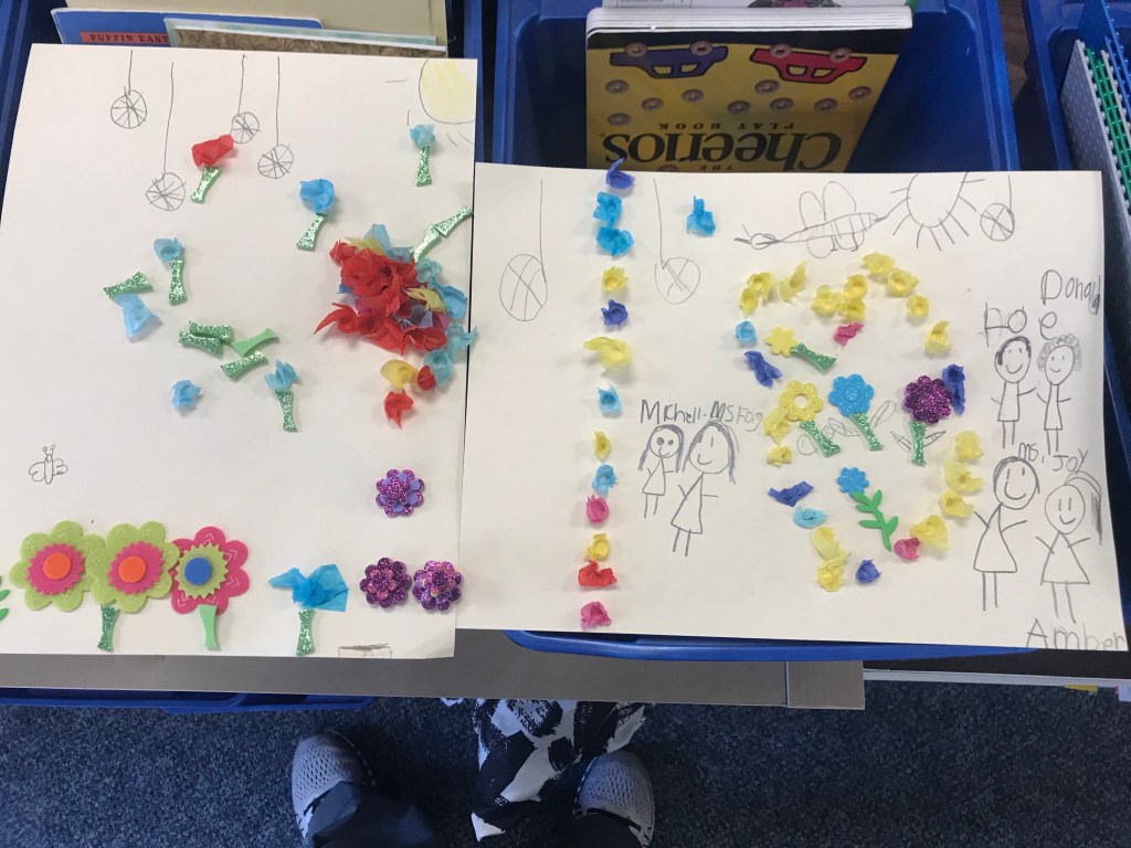 We took some time to do some fine art skills for our Spring Art. They twisted small pieces of tissue paper around the end of a pencil and pressed them onto a piece of cardstock with a dab of white glue. They loved it! It was very interesting to see how the kids liked to place their tissue paper to create certain images and shapes.